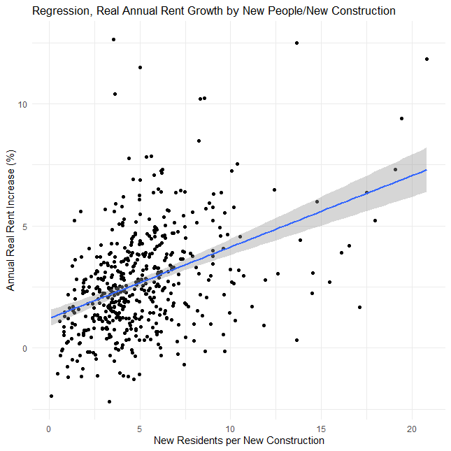 So let's take a look at what we get. which is basically a small but real effect. I mean, this is pretty significant but...that r^2 is pretty low. But what really throws me is the coefficient. Unless I'm grossly misreading this, we've got a pretty clear standard where the zero-intercept, or kinda the base rate, is 1% annual real growth in rent. Now that would require 0 new residents per building, which is kinda abstract, so let's set a real base rate of about 1.3% real annual rent growth if we build one new construction per new resident. That scales at about a quarter of a percent per additional person per property, so at 4 new residents per new construction we'd expect 2% annual rent growth and at 8 new residents per new construction we'd expect about 3% annual rent growth, all else held equal, after inflation.